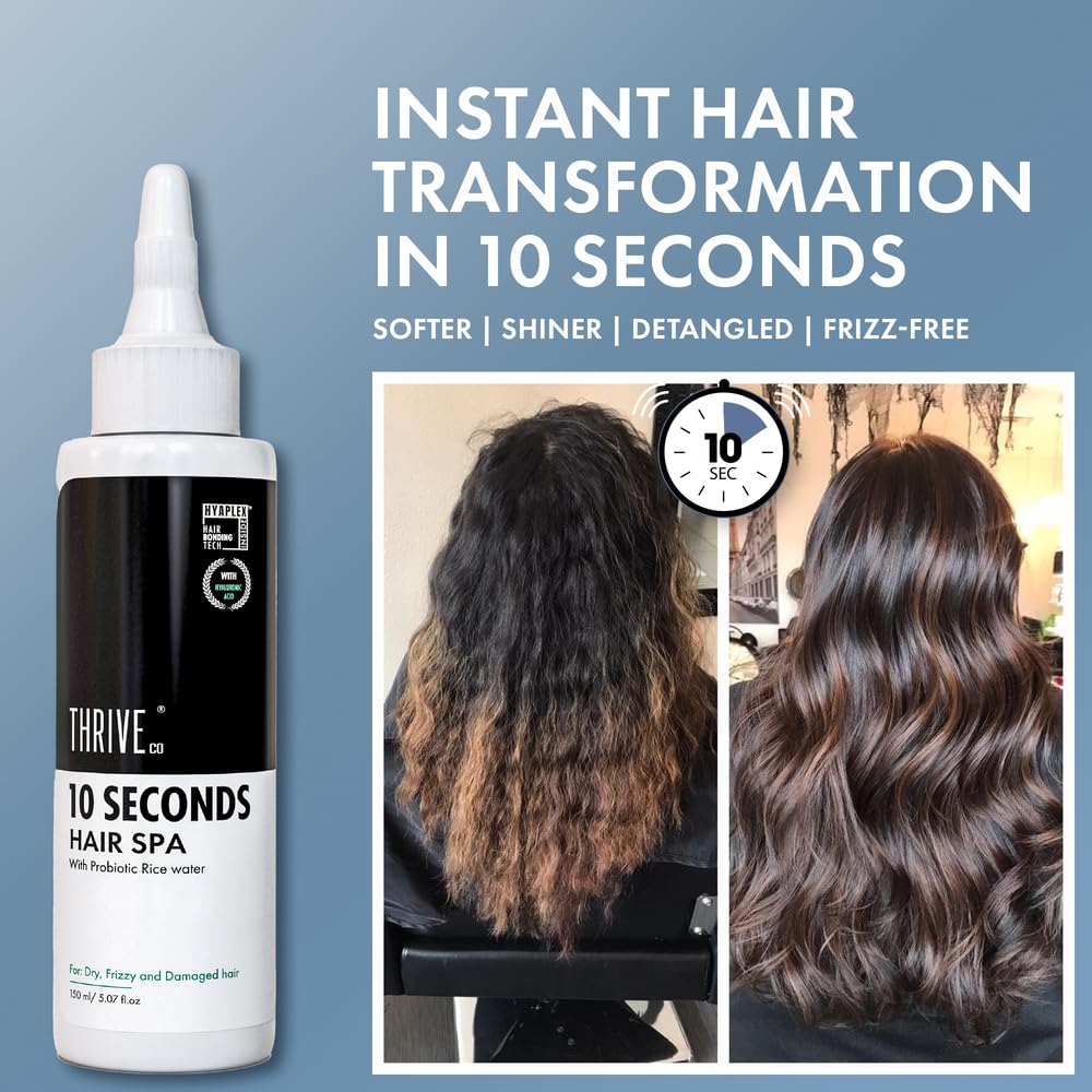 - CUTTING-EDGE TECH: ThriveCo's 10 Seconds Hair Spa is an extremely light liquid formula infused with proprietary ingredient Hyaplex which is a 3rd generation bond building technology that rebuilds the broken bonds inside the hair, repairs damaged cuticles, and shields hair from further damage. The unique formulation deeply penetrates dry hair & smoothes the hair cuticles for frizz-free, silkier and healthier-looking hair