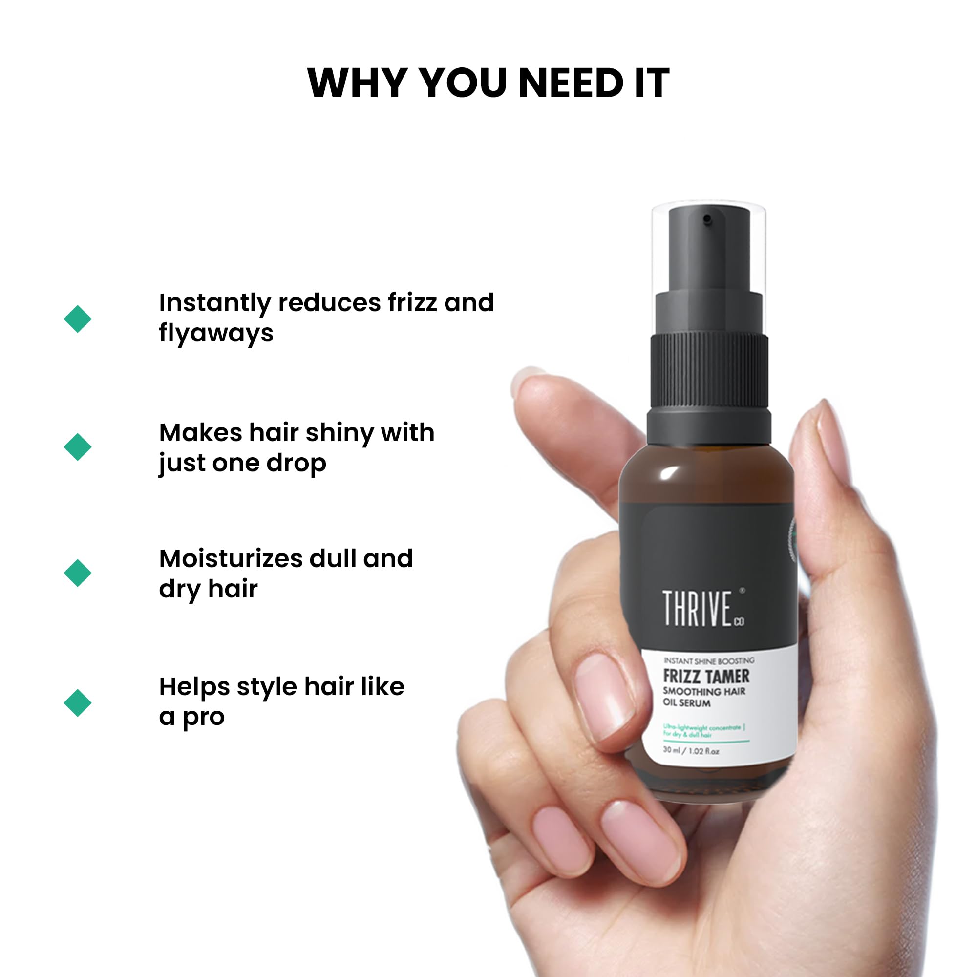 ThriveCo Frizz Tamer Smoothing Hair Oil Serum | For Smooth & Frizz-Free Hair | Gives Shine Up To 12 Hours | Hydrates Frizzy, Dry & Dull Hair | With Jojoba Oil, Mahua Oil | For Men & Women | 30ml