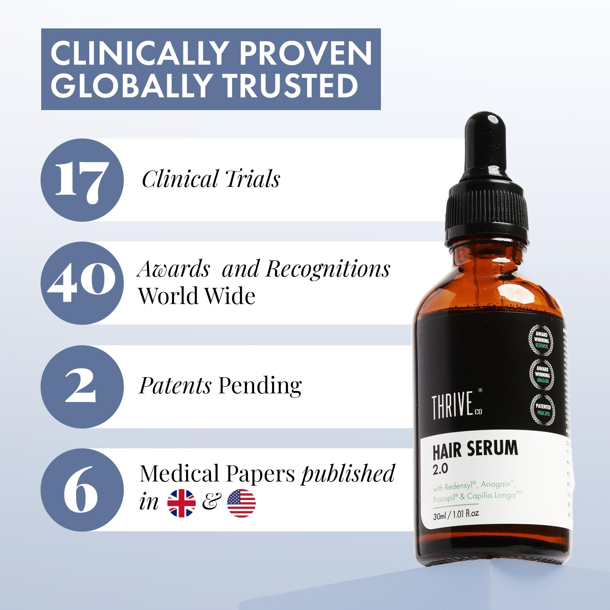 HAIR GROWTH: NO CLAIMS. ONLY EVIDENCE. With ThriveCo's Bestseller Hair Growth Serum 2.0, witness Clinically-Proven 150% IMPROVEMENT IN HAIR GROWTH in just 8 weeks, in addition to measurable improvements in Hair Density, Hair Fall Control and Hair Thickness. The pathbreaking results have been recognized and published by the international Journal of Cosmetic Dermatology.