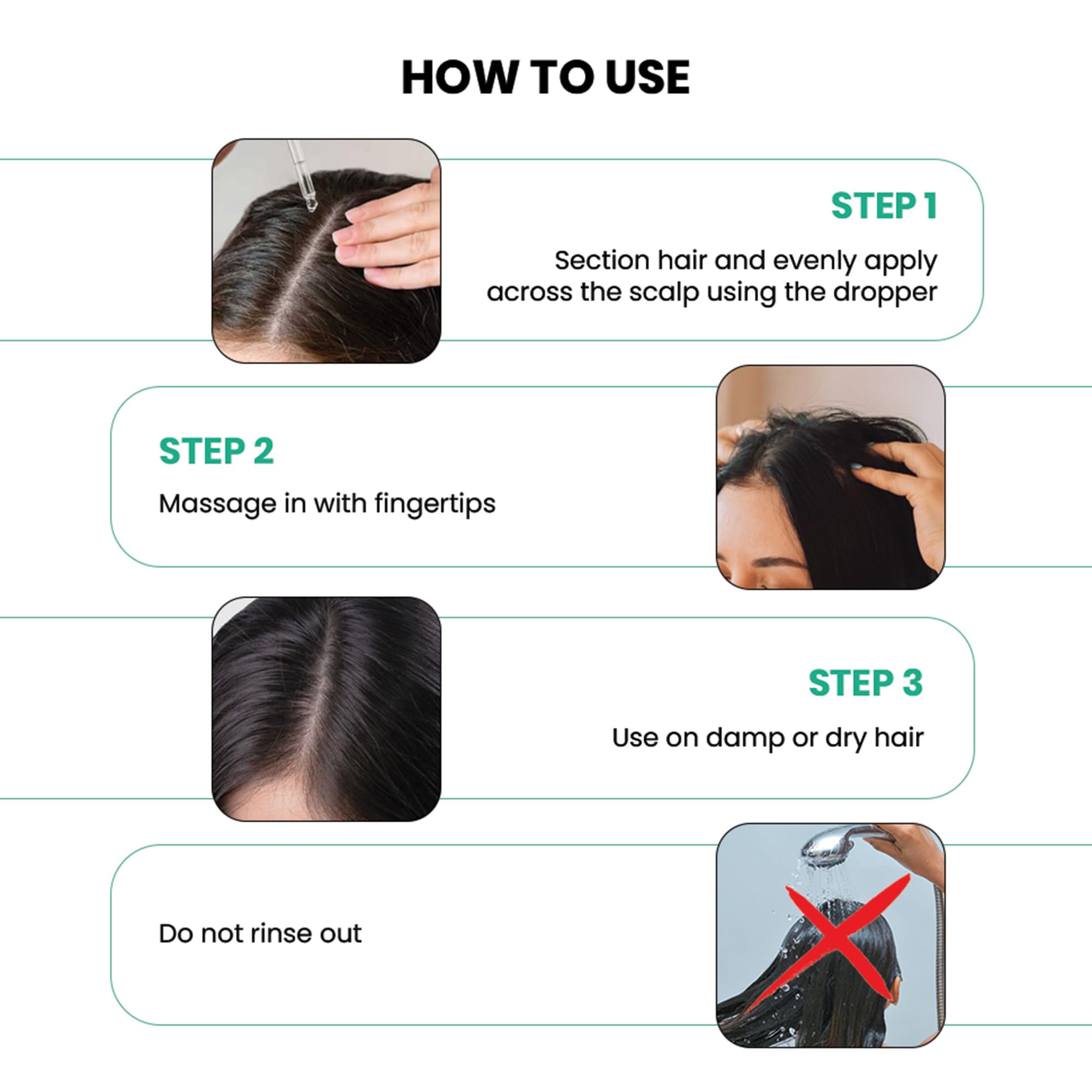 HOW TO USE: Section your hair and apply evenly across the scalp using the dropper. Massage in with your fingertips. Use it on damp or dry hair. Do not rinse out. Use it daily.