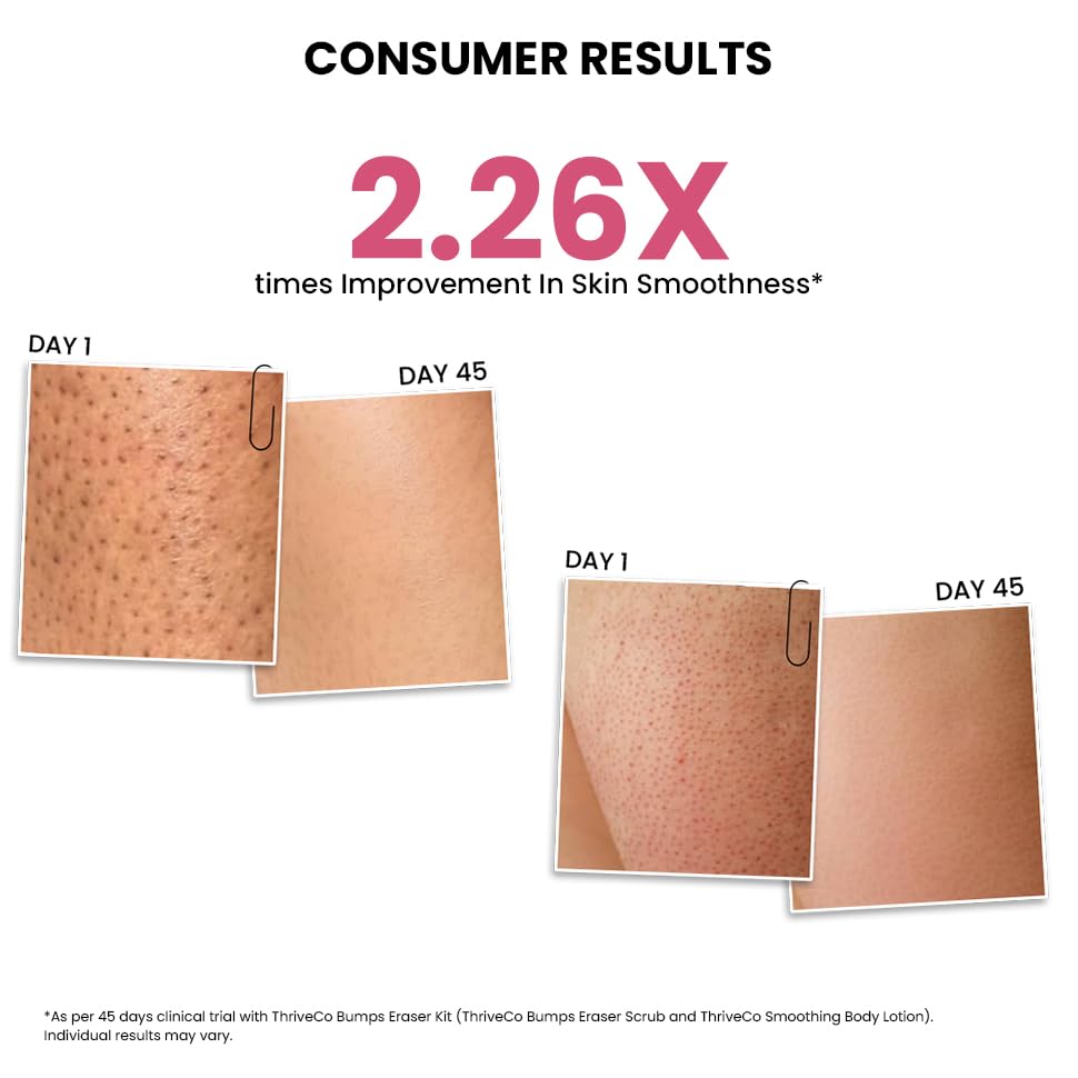 ULTRA SMOOTH FINISH: IMPROVE SMOOTHNESS BY 2.26X TIMES IN JUST 45 DAYS.* Uncover your best skin with a lotion that deeply hydrates the skin & helps fight against the cracking of the skin. Apply this for silky, smooth skin post shaving or waxing. *As per 45 days clinical trial with ThriveCo Bumps Eraser Kit (ThriveCo Bumps Eraser Scrub and ThriveCo Smoothening Body Lotion)