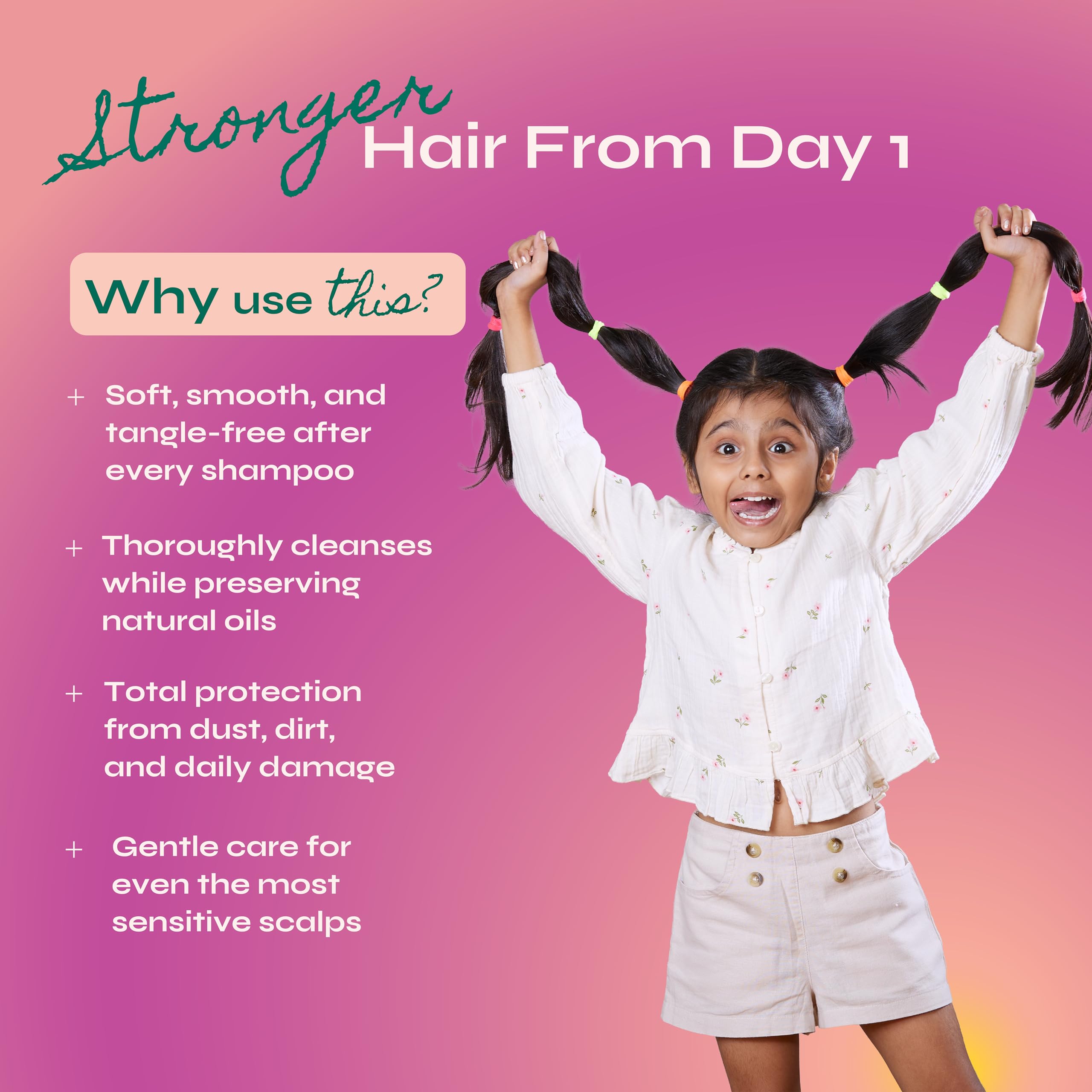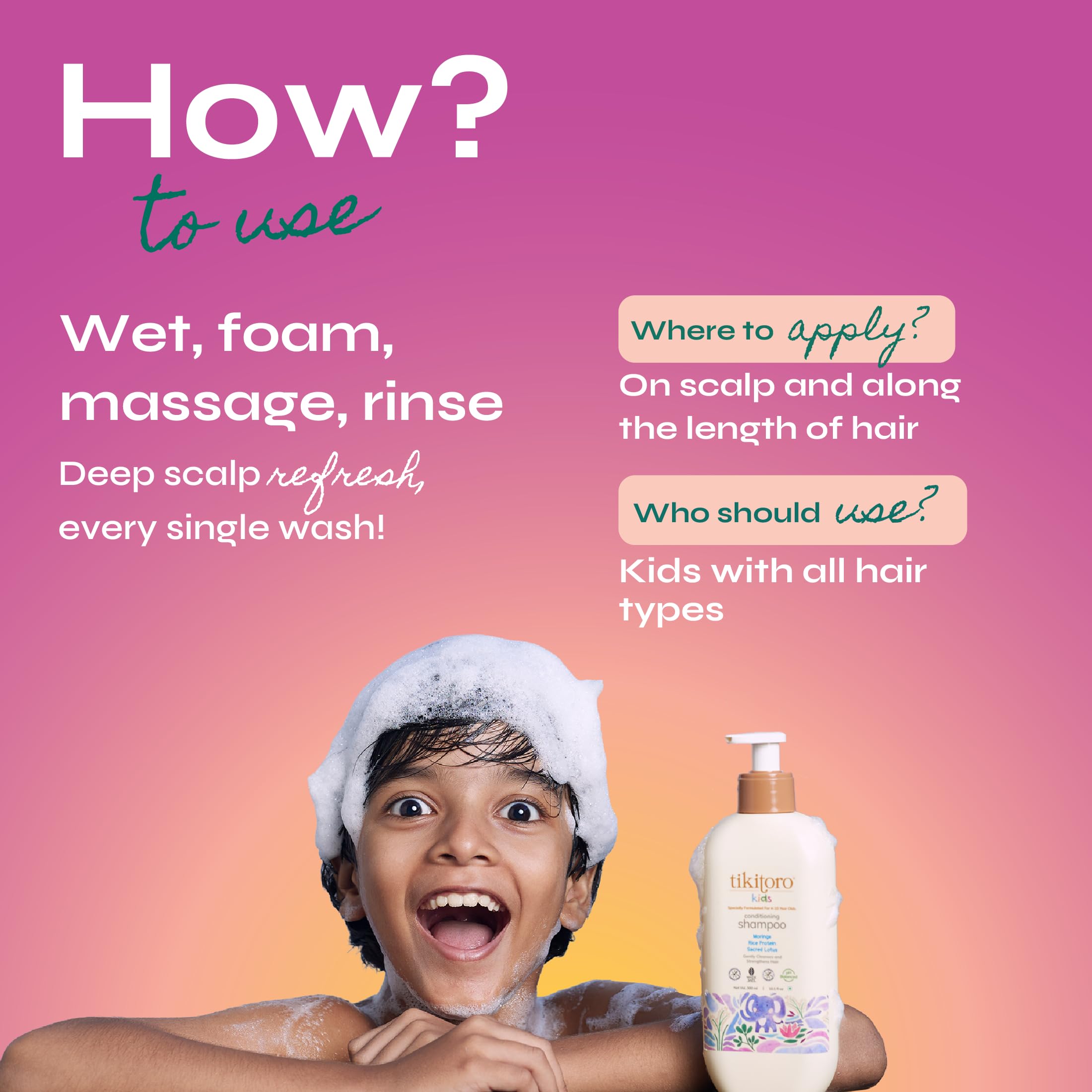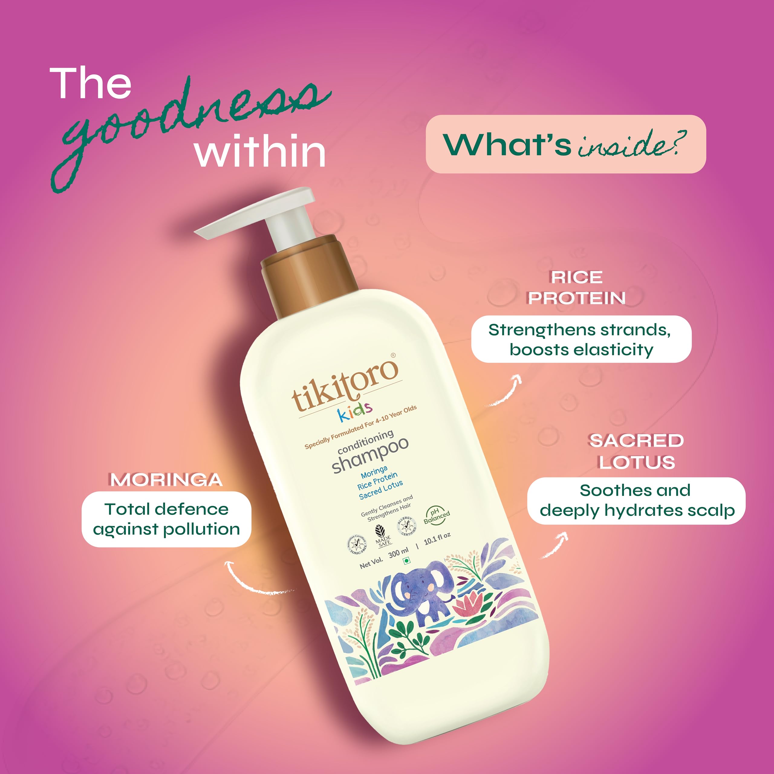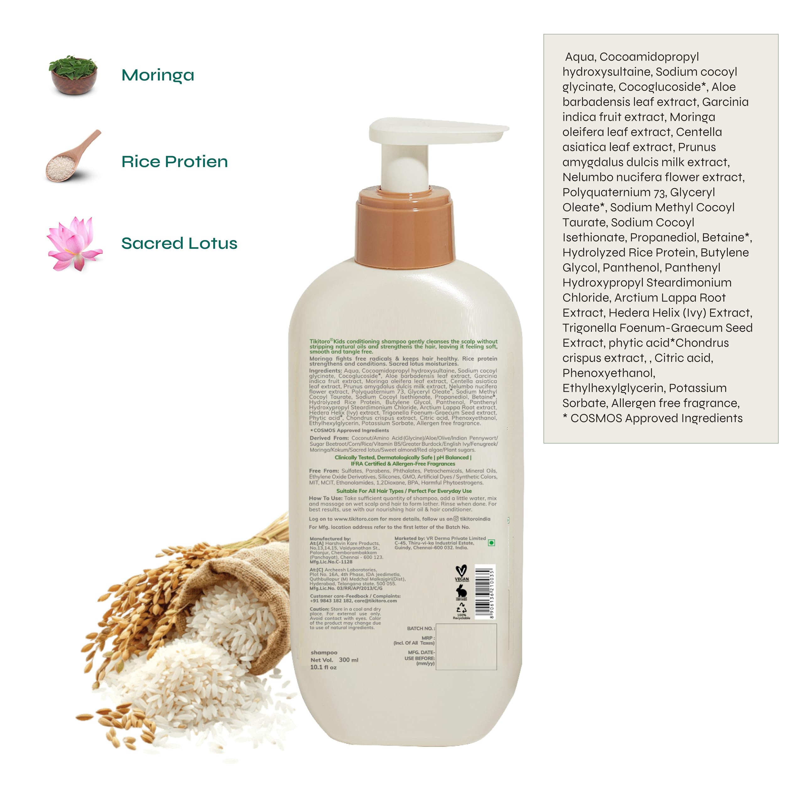 Tikitoro Kids Conditioning Shampoo for 4-10 years | pH 5.5 & Allergen-Free | Moringa, Rice Protein, Sacred Lotus Extract | No Parabens or Sulfates | 100% Vegan (300ml x 1)