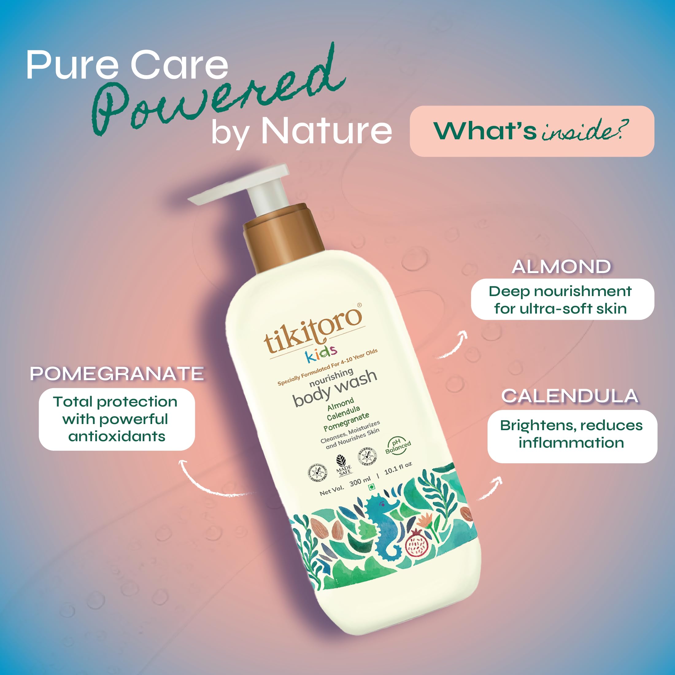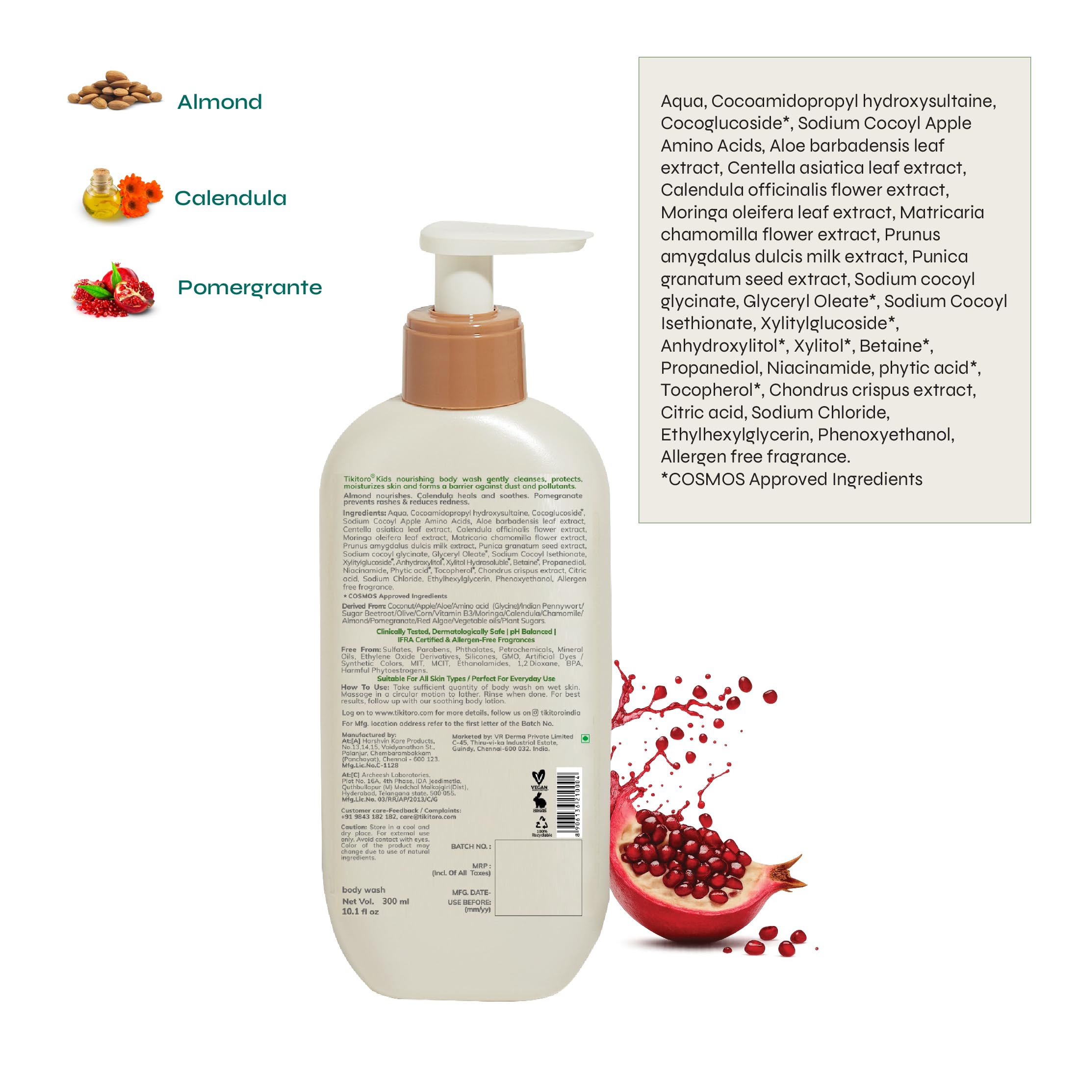 Key Ingredients in Nourishing Body Wash: Moringa, Indian pennywort, Calendula, Chamomile, Aloe vera, Red algae, Almond, Pomegranate.