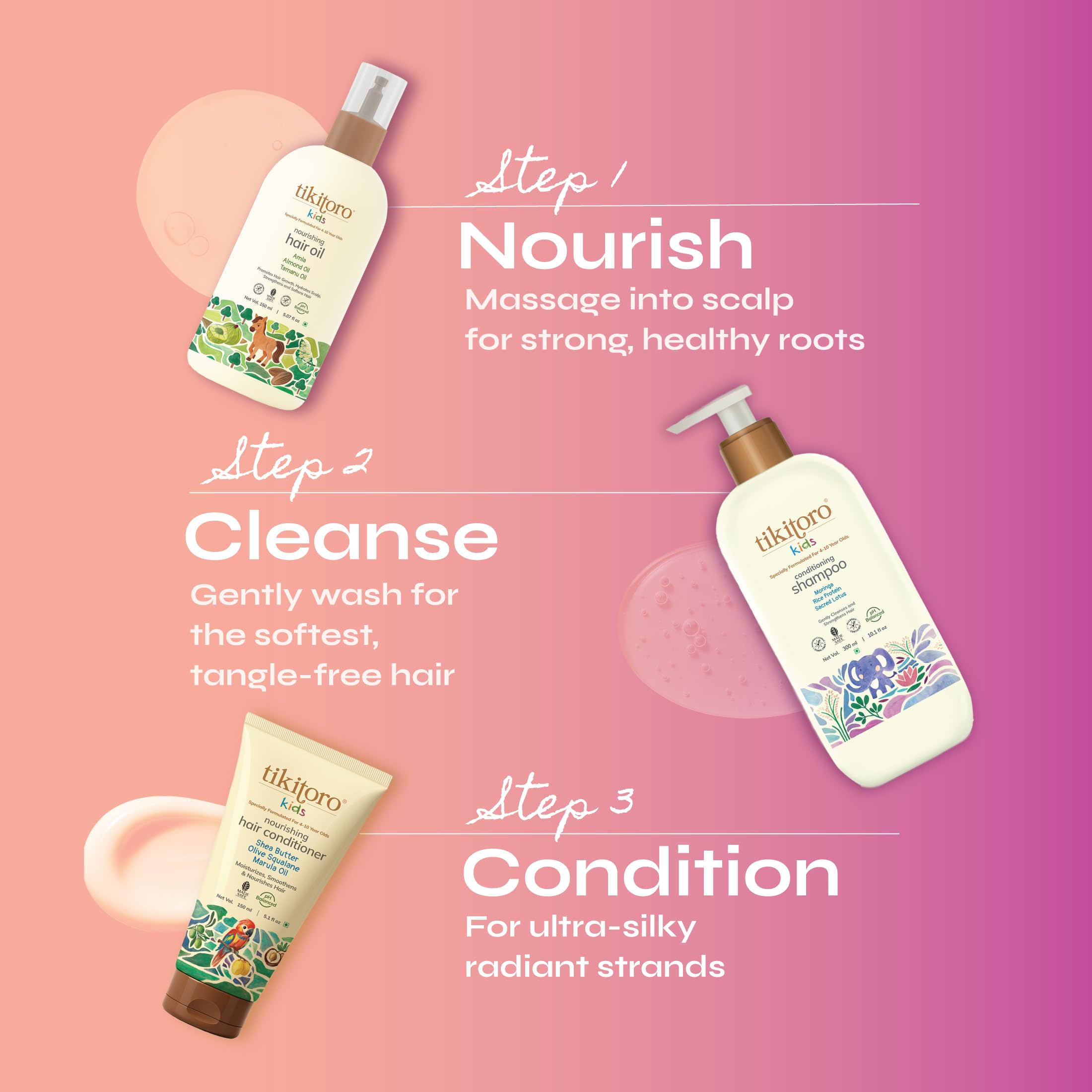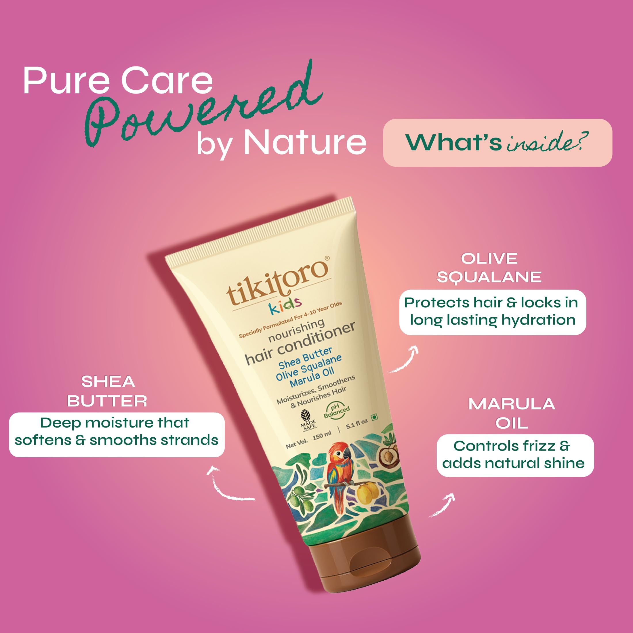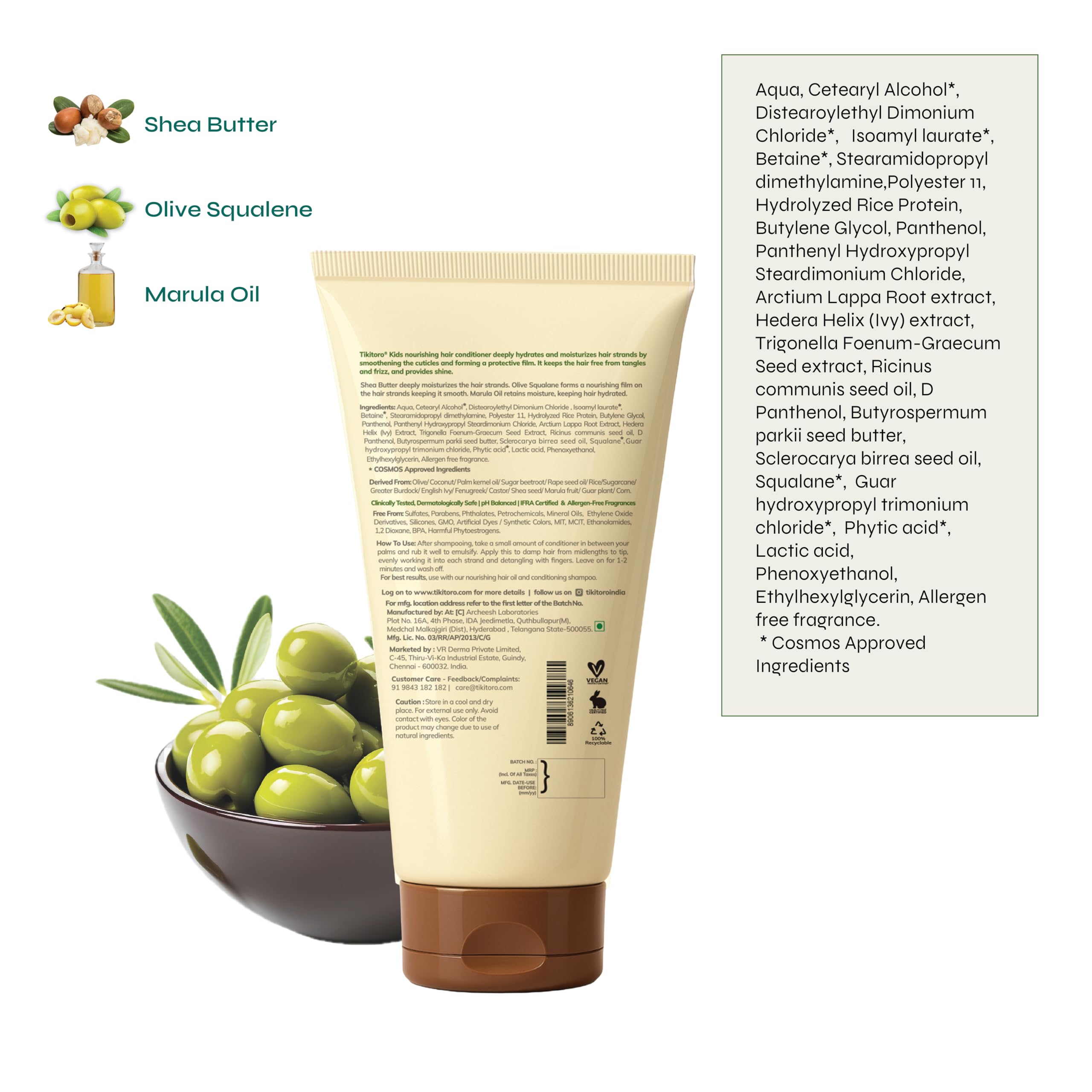 Details: This gentle, nourishing conditioner is made for kids (4–10), hydrating deeply while smoothing cuticles for soft, shiny, frizz-free strands. Lightweight and residue-free, it detangles knots, tames flyaways, and keeps hair silky-smooth every day. Enriched with Shea Butter, Olive Squalane, and Marula Oil, it locks in moisture, adds shine, and controls frizz naturally. Free from parabens, sulfates, silicones, CTAC, BTAC, and artificial colours—dermatologist-approved, clinically tested, and trusted by parents.