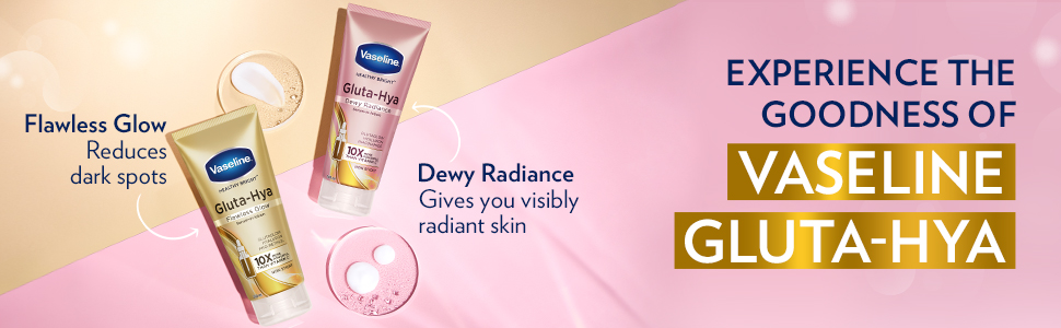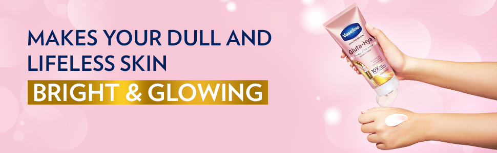 Details: For over 150 years, Vaseline has been passionate about healing skin and ensuring happy skin, everyday for EveryBody. We believe 'Healthy Skin is Beautiful Skin', that helps you keep up with the demands of life. Vaseline's Gluta-Hya is a revolutionary product range from the house of Vaseline with advanced brightening ingredients & has a super-light sensory. The unique sensory of the serum-burst lotion is lighter and fresher than a lotion, silkier and smoother than a gel. Gluta-Hya gives you ‘Visibly Brighter Skin from the First Use’. It is boosted with GlutaGlow technology which is 10x more powerful than Vitamin C. Boost your skin's moisture for dewy skin with Hyaluron. 10X Active Niacinamide that Boosts Skin's Natural Radiance. Non-sticky formula & Easy to absorb. Spreads easily all over the body. Bring back your Glow with Vaseline's Gluta-Hya Range. It comes in two variants: Flawless Glow for Even Toned Skin and Dewy Radiance for Radiant Skin. Intense heat, pollution and moisture loss takes a toll on your skin making it look dull and lose its natural glow. And applying your regular body lotions can feel heavy and sticky especially in summers. Unlike Heavy Lotions, Gluta-Hya has super-light texture which is perfect for Indian weather. Experience the goodness of Vaseline's Gluta-Hya Range, and say bye-bye to dull body skin.