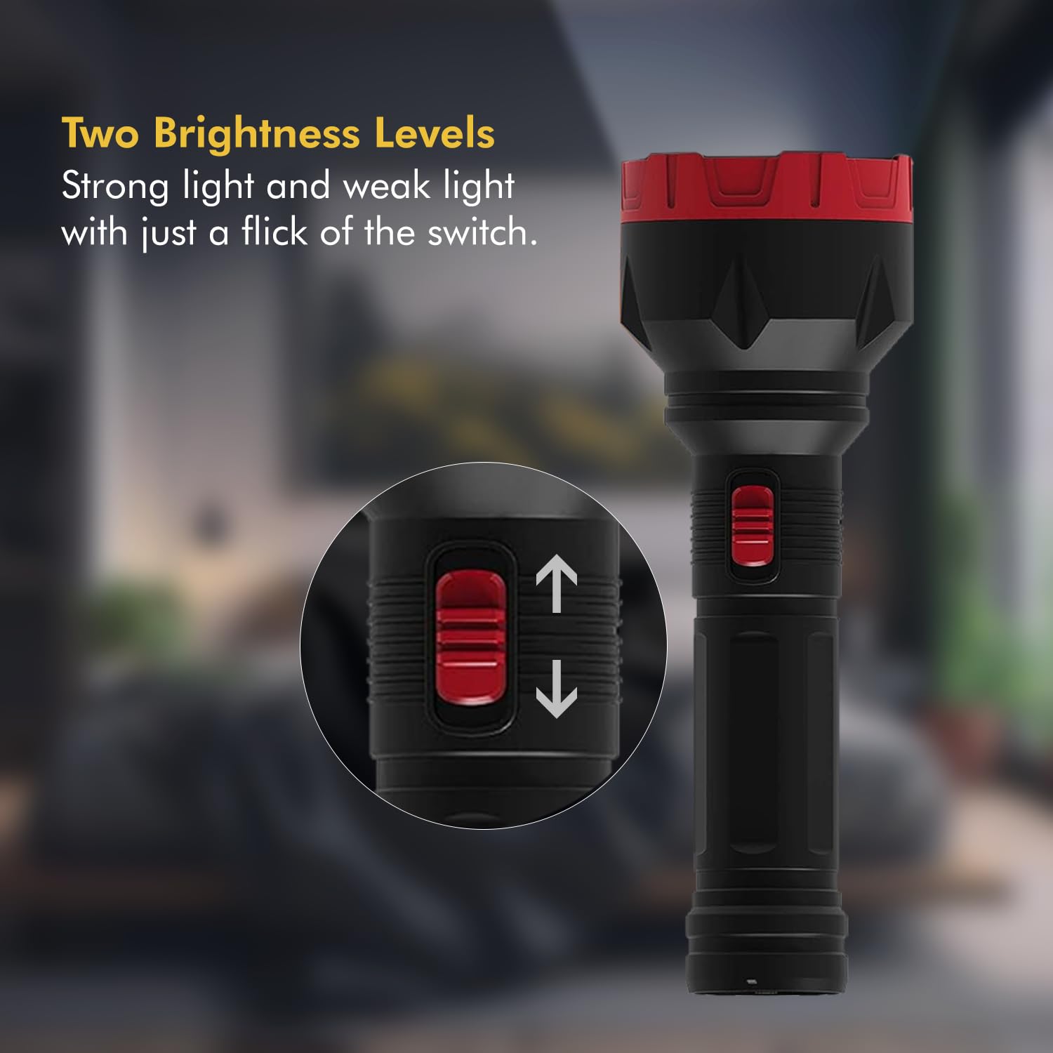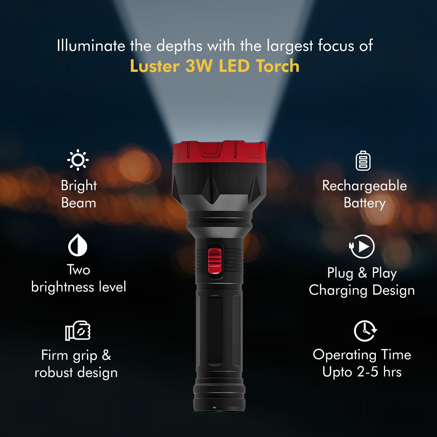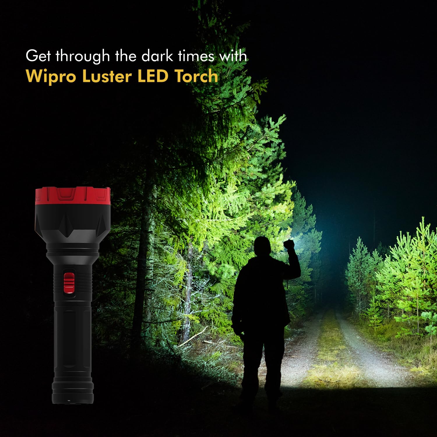 wipro Luster 3W Led Bright Rechargeable Torch with LED Light | Dimmable Emergency Torch Light with 1200 mAH Li-Ion Battery | Compact Torch with 2 Step of Brightness | Red | Pack of 1