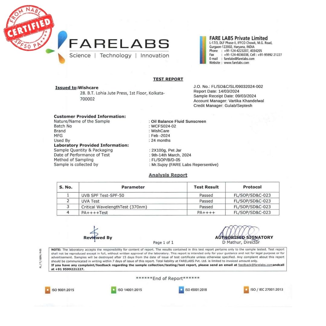 - SUNSCREEN FOR OILY SKIN & ACNE PRONE SKIN: WishCare Niacinamide Oil Balance Fluid Sunscreen is infused with oil balancing actives like Niacinamide, Oats Extract & Zinc PCA which helps you to get clear and acne free skin. This sunscreen also contains oil and calming ingredients like Cermaides and CICA to give you a soothing and clear skin all day long